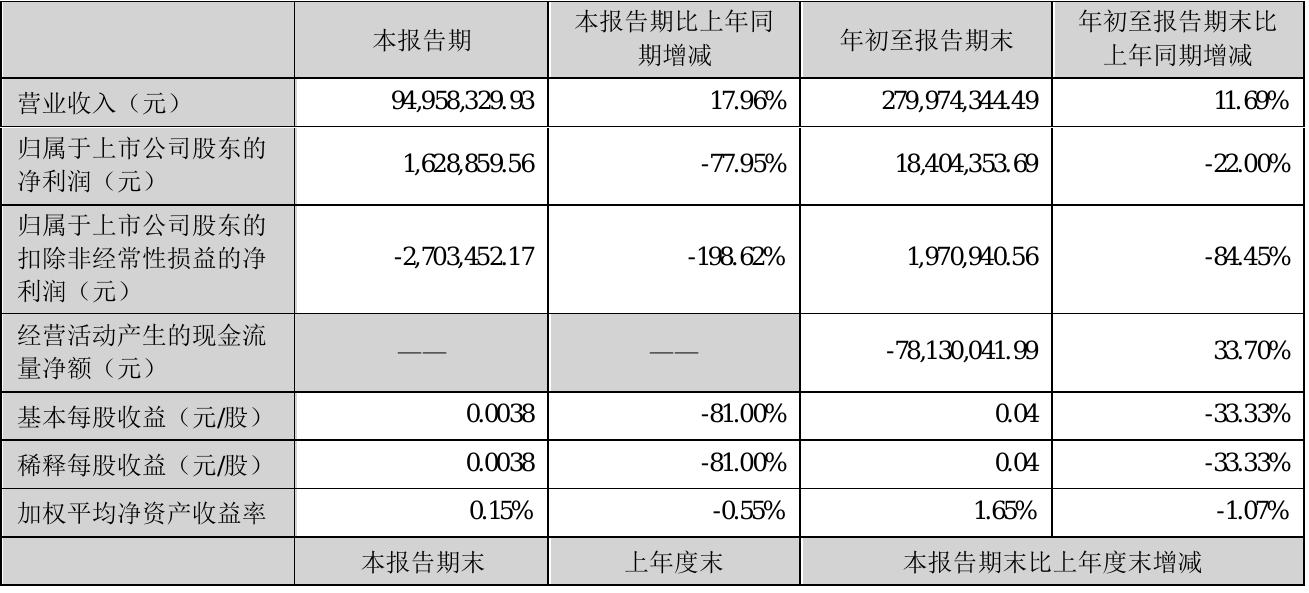 挖贝网10月26日,金现代(300830)近日发布2021年前三季度报告,报告期内营业收入279,974,344.49元,同比增加11.69%;净利18,404,353.69元,同比净利减少22.00%。