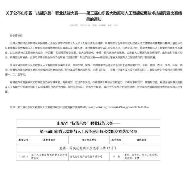 近日,山东省“技能兴鲁”职业技能大赛-第三届山东省大数据与人工智能应用技术技能竞赛在济南市举行,金现代公司“基于人工智能技术的智慧识才管理系统”在本次比赛中荣获一等奖。