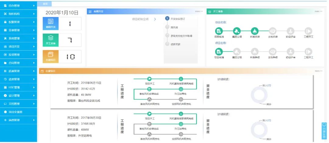 针对风电基建项目进度难跟踪、易延期的问题,风电工程基建管理系统制定了质量验评体系与工程进度的关联数据模型,以数出同源为原则,让系统依据工程质量验收的时间节点,自动统计项目整体进度、单位工程进度,生成工程月报,减轻一线员工数据录入工作量的同时,也避免了工程进度的虚假上报,保证项目按期交付。同时,系统还提供项目全景图,整体展示资金、进度、质量、合同等信息,便于管理人员综合掌控项目情况。