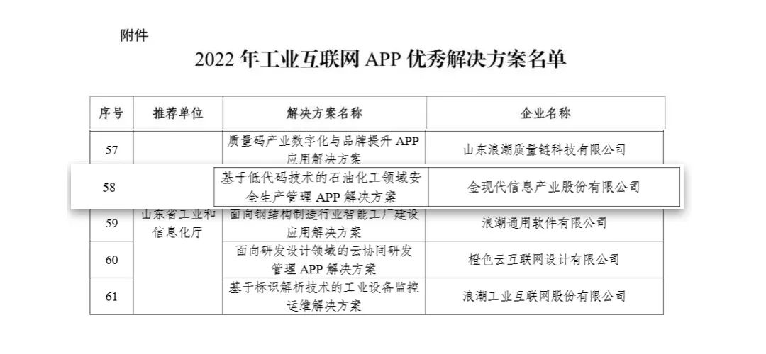 工业和信息化部近期公布2022年工业互联网APP优秀解决方案名单,金现代“基于低代码技术的石油化工领域安全生产管理APP解决方案”成功入选。方案依托全面兼容国产化软硬件环境的轻骑兵低代码开发平台,以及公司在化工HSE管理、双重预防管理等业务领域的经验积累,打造符合石油化工领域安全生产管理制度与规范的解决方案,为石油化工企业的安全生产与合规经营提供技术支持。