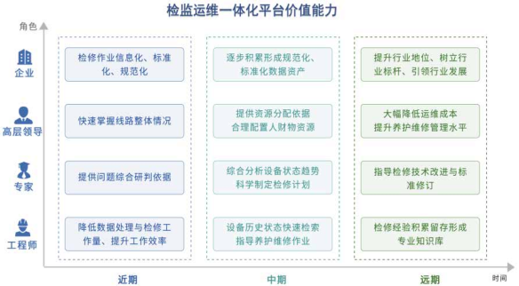 城轨运检一体化智能管理平台是金现代公司助力轨道交通行业发展、提供安全运营保障的重要产品之一。公司充分借鉴“大智物移云链”技术在生产和生活等领域广泛应用的经验,并与中国铁道科学研究院集团有限公司开展深度合作,结合轨道交通基础设施运维工作的特点及管理工作的发展方向,打造以数据分析应用和智能运维管理为核心的、服务贯穿整个运营组织架构的、具有新一代标杆特征的城轨运检一体化智能管理平台,实现从“最小数据集”向“大数据”的转变,用数字进行管理、决策、创新。