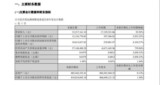 公司4月29日披露的2022一季报显示,报告期实现主营收入3321.72万元,同比上升93.92%;归母净利润1213.68万元,同比上升2953.22%。