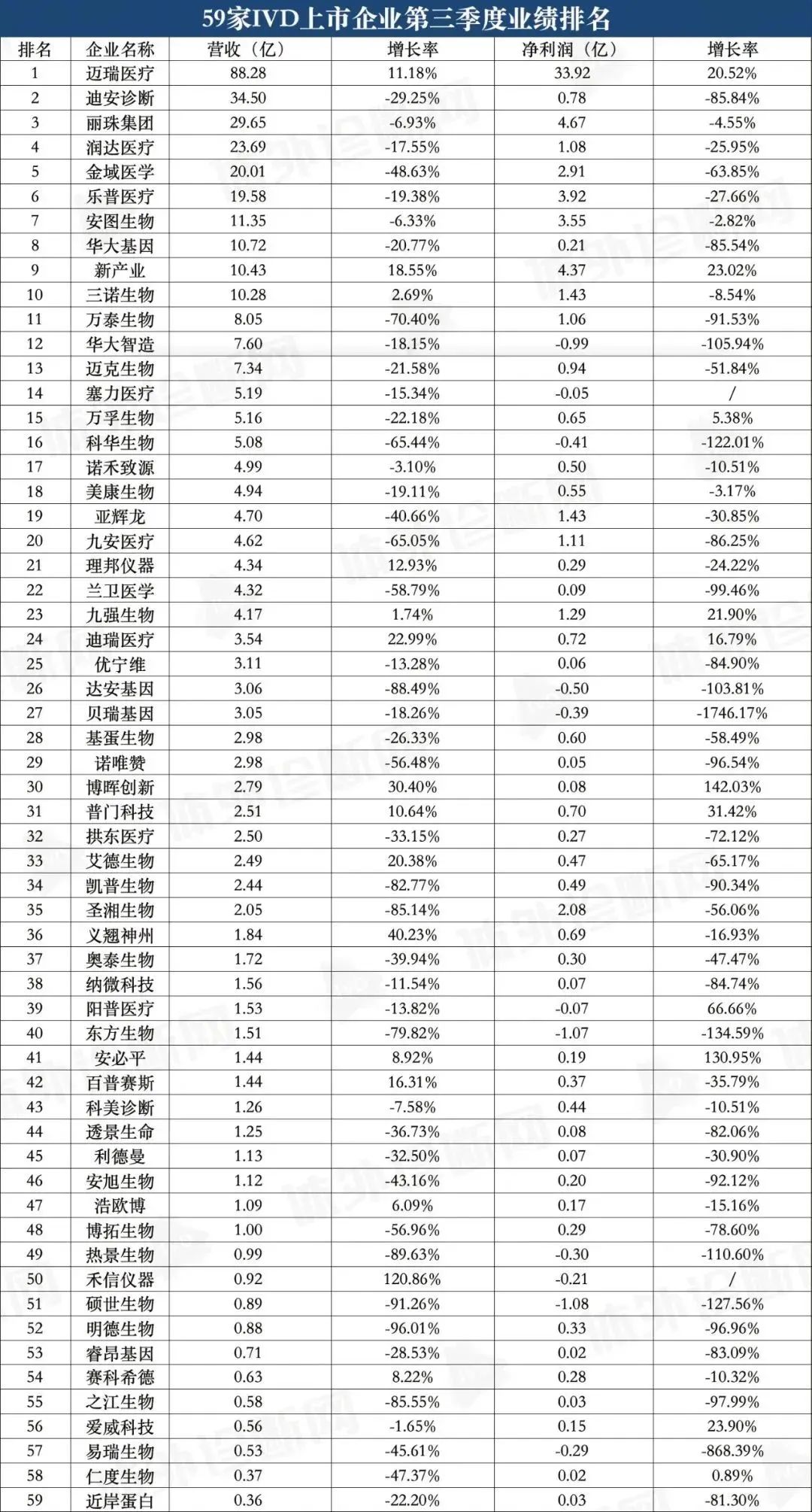 近日,59家IVD上市公司纷纷公布了第三季度报表,其中超过40家企业的营收和净利润都发生了双暴跌。迈瑞作为老大哥依旧稳坐第一的宝座,是绝对的营收和增长王者,除了迈瑞,业绩表现最亮眼的当属新产业。无论是在业绩十强还是发光五虎中,都“紧咬”迈瑞不放,可以说是迈瑞的最强劲敌!