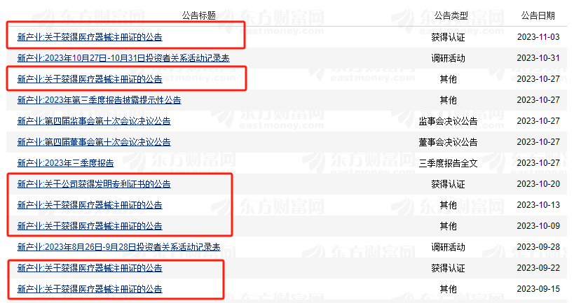 小编在查询新产业公告时发现,不到两个月的时间内,新产业发布了六则下证公告和一则获得发明专利公告,累计有20项产品获证,可见其低调搞研发的执行力。