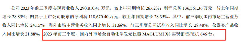 报告中显示,2023年前三季度,公司全自动化学发光仪器 MAGLUMI X8 在全球实现了销售/装机646台,表明其在全球市场上得到了广泛的认可和使用。