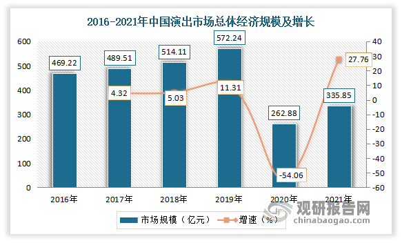 自“十二五”以来,随着国家不断重视文化产业发展,国民经济的持续发展,以及消费结构的不断升级,带动了我国文化娱乐产业发展。在此背景下,演出市场规模不断扩大。虽然。2020年度,受新冠疫情的影响,全国演出市场总体经济规模下跌,但随着疫情好转,2021年演出市场总体经济规模迅速恢复,达到335.85亿元,相较于上年同比增长27.76%,未来我国演出市场规模将持续增长。