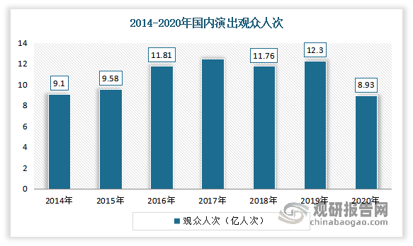 整体来看,2015-2020年我国艺术表演团体机构出场次数呈倒“v”走势。数据显示,2020年中国艺术表演团体演出场次为225.61万场,较2019年减少了71.19万场,同比减少23.99%;国内观众人次为8.93亿人次,同比下降27.4%。