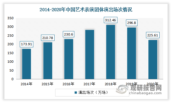 2015以来,随着科学技术的飞速发展和民众生活水平的不断提升,文化生产和文化需求发生了很大变化,文化建设正式步入大众化时代,我国艺术表演团体演出场次逐年增加。但进入2019年,艺术表演团体演出场次开始下降。尤其是2020年,受疫情影响,艺术表演团体演出场次明显下降。但预计随着疫情的好转,居民消费的提升,市场将逐步恢复。