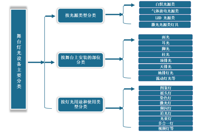 舞台灯光设备按光源类型可分为白炽光源类、气体放电光源类、LED 光源类和激光光源类灯具;按舞台上安装的部位分为面光、耳光、脚光、柱光、顶排光、天排光、地排灯光和流动灯光等;按灯光用途和使用类型的不同,可分为图案灯、摇头灯、染色灯、激光灯、频闪灯、追光灯、光束灯、多合一灯和视频灯等。不同的舞台灯光设备有着其作用,不同场景的需求,通过控制舞台灯光的照度、色彩、光束,给观众带来不一样的视觉效果。