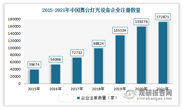 受市场发展向好,近年来我国舞台灯光设备行业迅速发展,取得长足进步,市场规模不断扩大,企业数量迅速增长。数据显示,截止2021年末,全国舞台灯光注册企业数已经达到17.39万家。
