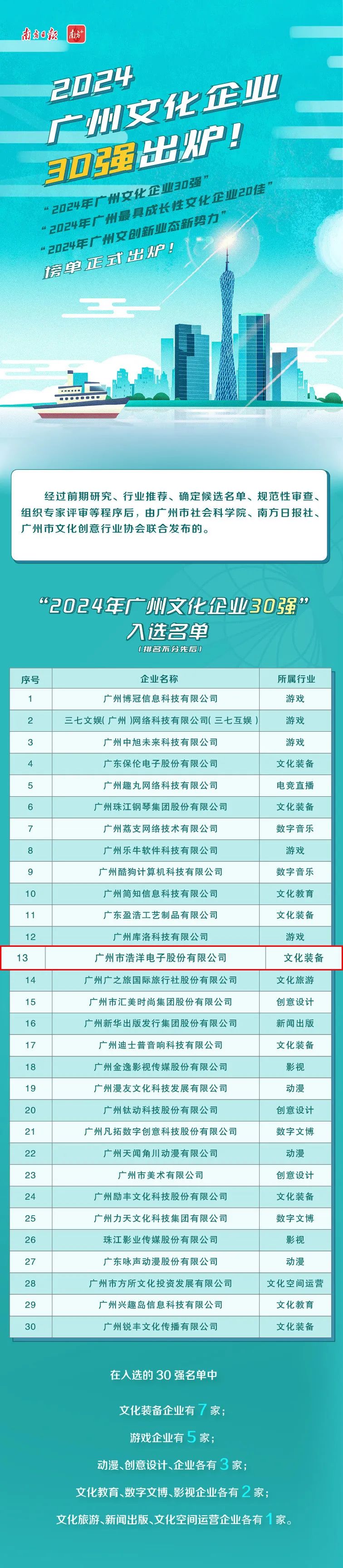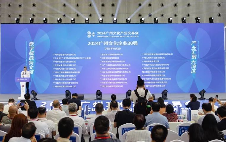 9月27日至29日,2024广州文化产业交易会在广交会展馆A区举办。在27日的广州文交会启动仪式上,由广州市社会科学院、南方日报社、广州市文化创意行业协会联合评出的“2024年广州文化企业30强”系列榜单发布,并于当日举办的“2024广州文交会智库学术年会暨广州文化企业30强对话会”活动上授牌。浩洋股份凭借强大的科技研发创新实力,荣登“2024广州文化企业30强”榜单。