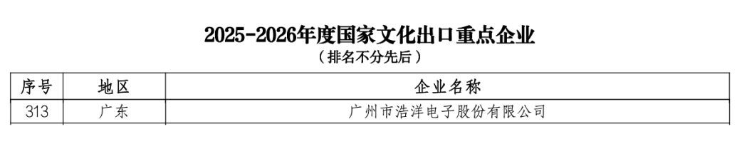 近日,商务部、中央宣传部、文化和旅游部、广电总局发布了2025-2026年度“国家文化出口重点企业”名单。凭借在演艺灯光领域的卓越表现与突出的海外市场拓展成果,广州市浩洋电子股份有限公司(以下简称“浩洋股份”)再次成功入选,成为文化出口领域的标杆企业之一。这一国家级荣誉是对浩洋股份在推动中国文化产品与服务“走出去”、提升国际影响力方面所作出重要贡献的权威认可。