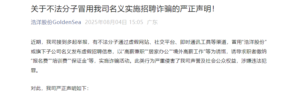 浩洋股份在声明中强调,其有正式招聘信息均通过官方渠道发布,其他非官方渠道发布的招聘信息均属虚假信息。