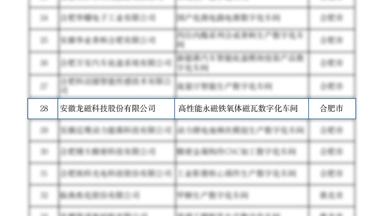 近日,安徽省经济和信息化厅公示了《2023年安徽省智能工厂和数字化车间名单》,经企业自愿申报、主管部门审核推荐、现场核查、专家评审等程序,龙磁科技高性能永磁铁氧体磁瓦数字化车间被评为安徽省级数字化车间。