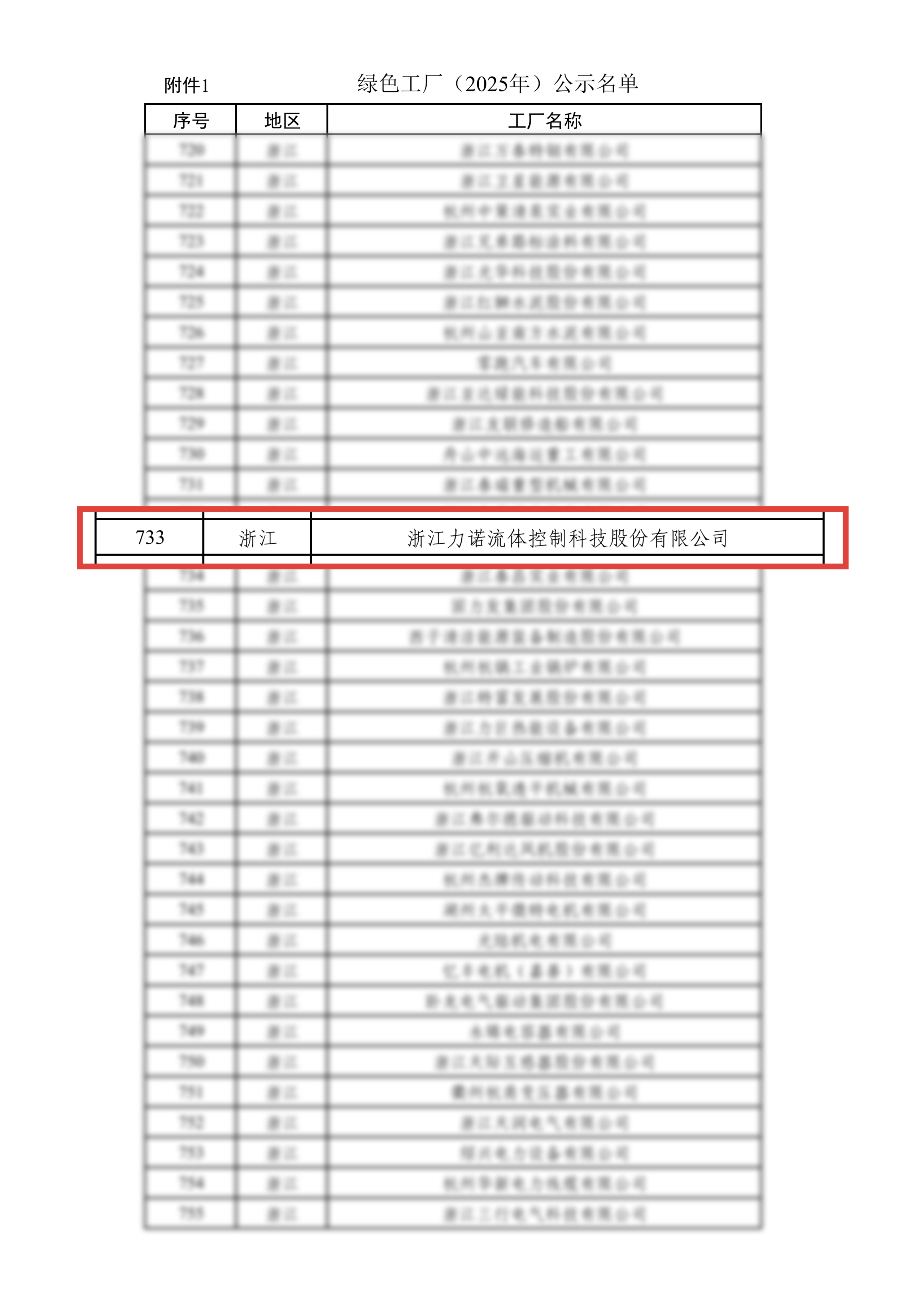 近日,工业和信息化部节能与综合利用司对2025年度国家级绿色工厂名单进行公示。浙江力诺流体控制科技股份有限公司凭借其在绿色制造、节能减排等方面的突出表现,成功入选该名单,标志着我司在可持续发展和绿色工厂建设方面迈入国家认可的新阶段。