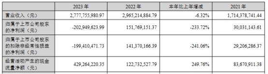 博汇股份(300839.SZ)披露的2023年年度报告显示,去年,公司营业收入27.78亿元,同比下降6.32%;归母净利润-2.03亿元,上年同期为1.52亿元;扣非净利润-1.99亿元,上年同期为1.41亿元;经营活动产生的现金流量净额为4.29亿元,同比增长249.76%。