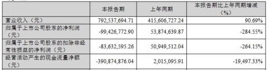 2024年第一季度报告显示,公司营业收入7.93亿元,同比增长90.69%;归母净利润-9942.68万元,上年同期为5387.46万元;扣非净利润-8363.26万元,上年同期为5094.95万元;经营活动产生的现金流量净额为-3.91亿元,上年同期为201.51万元。