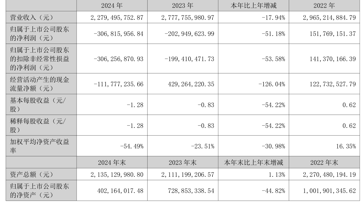 中国经济网北京4月23日讯博汇股份(300839.SZ)昨日晚间披露2024年年度报告。2024年,公司实现营业收入22.79亿元,同比下降17.94%;归属于上市公司股东的净利润为-3.07亿元,上年同期为-2.03亿元;归属于上市公司股东的扣非净利润为-3.06亿元,上年同期为-1.99亿元;经营活动产生的现金流量净额为-1.12亿元,上年同期为4.29亿元。