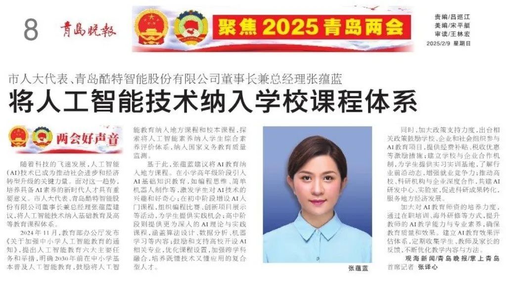 近日,青岛进入“两会时间”。作为青岛市第十七届人大代表,酷特智能董事长张蕴蓝建议,将人工智能技术纳入基础教育及高等教育课程体系。张蕴蓝表示,随着科技的飞速发展,人工智能(AI)技术已成为推动社会进步和经济转型升级的关键力量。面对这一趋势,培养具备AI素养的新时代人才具有重要意义。