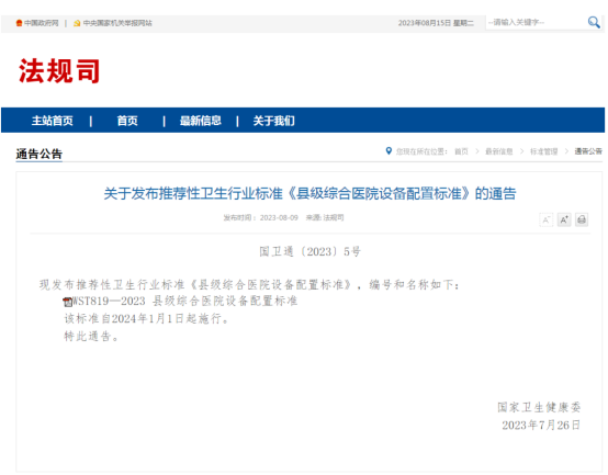 8月9日,国家卫健委官网发布《县级综合医院设备配置标准》。"该标准"自2024年1月1日起施行。该标准规定了县级综合医院(不超过1500床位规模)万元及以上设备配置的基本原则,并提出县级综合医院应在明确其功能定位的基础上,科学合理配置与自身规模和服务量相适应的设备品目及数量。除临床科室配备必备专科检查治疗设备外,其他设备原则上均应统一管理使用。