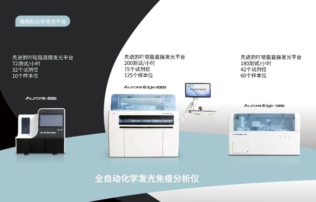 选择康华不仅是基于试剂项目齐全和优异,还在于我们充分考虑到了不同客户对仪器的需求。康华生物Aurora全自动磁微粒化学发光仪具有先进、快速、精准、便捷、高效、全面等优势,拥有Aurora Edge-2000i、Aurora Edge-1000i、Aurora 500i三款不同的机型,从小机身到高通量,可满足于不同层级客户的需求。
