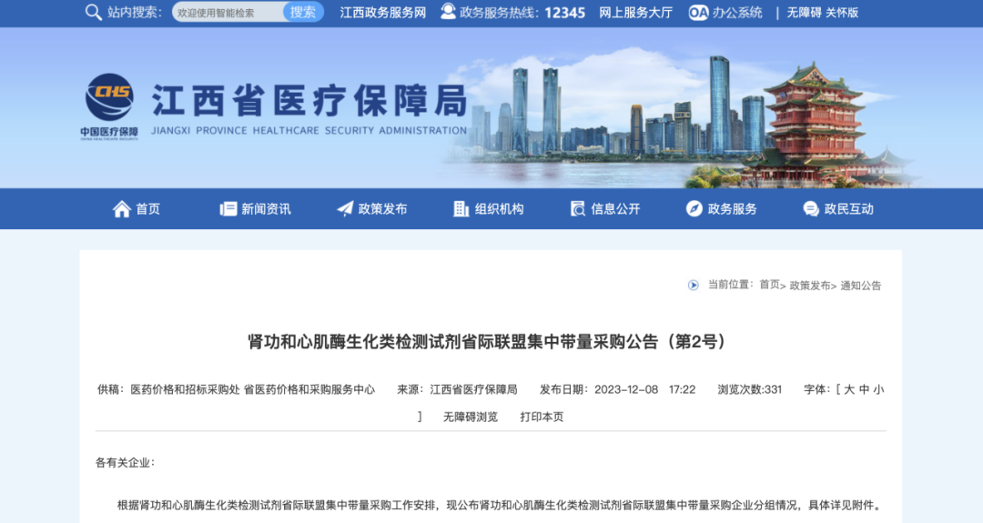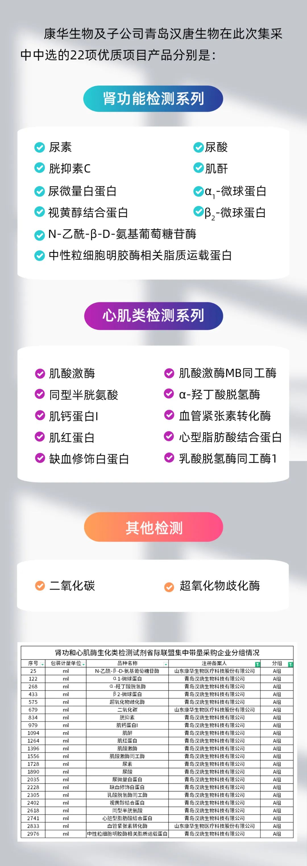 12月8日,江西省医保局发布“肾功和心肌酶生化类检测试剂省际联盟集中带量采购公告(第2号)”。此次集采共220家企业参与,康华生物及子公司青岛汉唐生物共有22个项目入围A组。