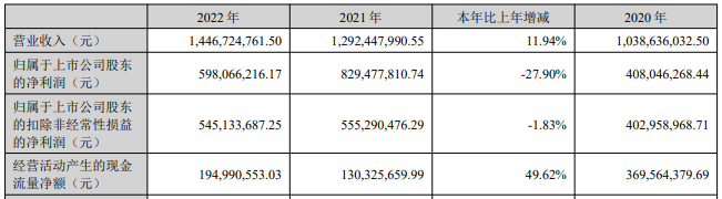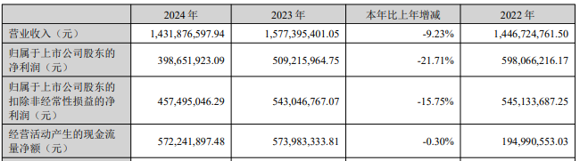 2021年至2024年,康华生物营业收入分别为12.92亿元、14.47亿元、15.77亿元、14.32亿元,归属于上市公司股东的净利润分别为8.29亿元、5.98亿元、5.09亿元、3.99亿元,归属于上市公司股东的扣除非经常性损益的净利润分别为5.55亿元、5.45亿元、5.43亿元、4.57亿元,经营活动产生的现金流量净额分别为1.30亿元、1.95亿元、5.74亿元、5.72亿元。