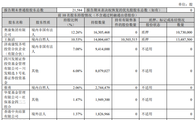 康华生物2025年一季报显示,奥康集团、王振滔、康悦齐明系公司前三大股东。