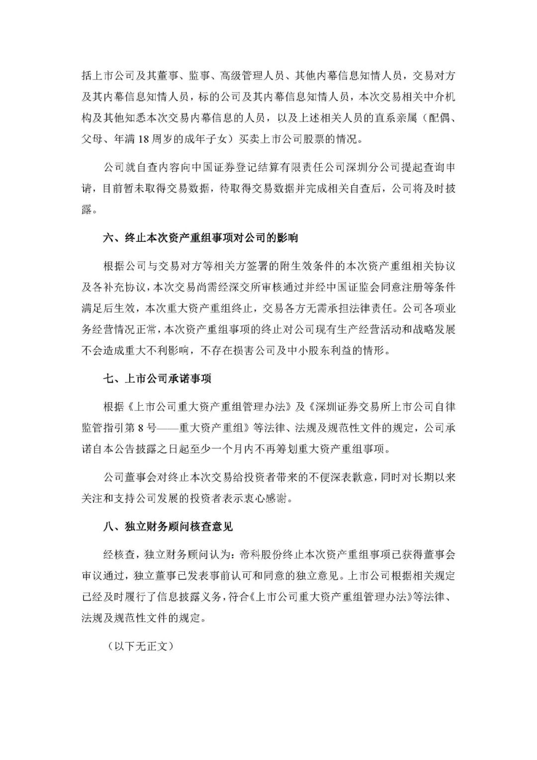 终止本次资产重组事项对自身的影响,帝科表示根据公司与交易对方等相关方签署的附生效条件的本次资产重组相关协议及各补充协议,本次交易尚需经深交所审核通过并经中国证监会同意注册等条件满足后生效,本次重大资产重组终止,交易各方无需承担法律责任。本次资产重组事项的终止对公司现有生产经营活动和战略发展不会造成重大不利影响,不存在损害公司及中小股东利益的情形。