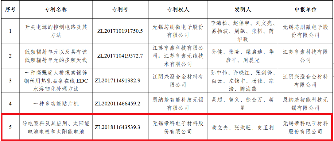 日前,无锡市人民政府公布了第十四届无锡市专利奖获奖项目,帝科股份DKEM?申报专利“导电浆料及其应用、太阳能电池电极和太阳能电池(专利号:ZL201811643539.3)”荣获本届专利奖最高等级的金奖,彰显了帝科股份DKEM?自主研发创新的硬实力和对于知识产权保护的高度重视。