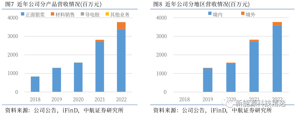 光伏行业N型转型趋势加快,TOPCon电池产量释放,而2022年TOPCon电池银浆国产化率达到85%左右。公司具有全品类导电银浆产品,包括P型、N型TOPCon电池全套银浆产品、HJT全套低温银浆及低温银包铜浆料产品,其中TOPCon全套银浆产品处于行业领先地位、出货量随TOPCon放量而大幅增加。HJT电池用系列产品已完成多家头部企业认证;公司还持续推动IBC背接触电池、钙钛矿/晶硅叠层电池银浆产品开发与产业化,掌握无网结网版超细线印刷技术、分步印刷技术、SMBB多主栅互联等技术。公司与晶科、天合、晶澳、通威等行业龙头均建有长期稳定的合作关系,获得客户广泛认可,未来公司的市占率有望进一步提高。