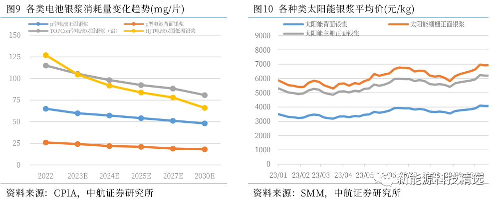 光伏行业保持高景气度,根据CPIA数据,2022年我国电池产量为330.6GW,同比+67.1%;对应银浆总耗量为4177吨,同比+35.9%。据InfoLink保守预测,2023年全球光伏需求将达390GW,由此预计全球将生产超过450GW电池片需求量,对应银浆需求量达到5100吨以上。Infolink预测,2023年TOPCon电池市占率有望达到约30%,TOPCon电池是天然的双面电池,银浆需求量高于P型电池,在金属化方面降本提效是N型电池的重要发展方向之一。