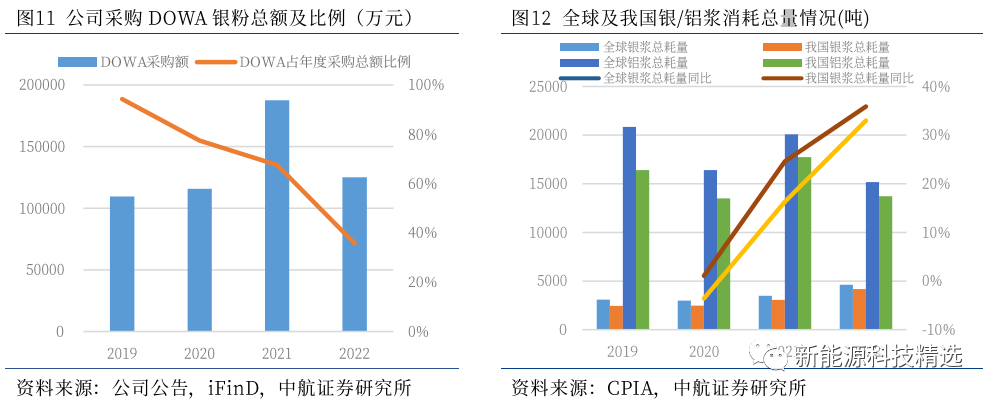 银粉为光伏银浆主要原材料,大量进口银粉会加大公司汇兑风险,国产银粉稳定性逐步提升,并在价格上具有优势,因此公司大力推进国产银粉导入替代,加强成本管理。2022年,公司进口DOWA银粉比例为35.71%,较上年下降了31.85pct,国产银粉的替代使用有利于保障公司供应链安全、降低成本以及银点、外汇波动风险,随着国产粉使用比例的提升,公司的盈利能力将进一步增强。
