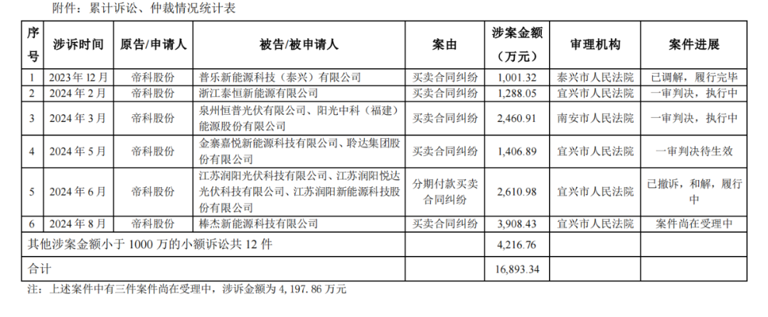 8月28日帝科股份发布了关于累计诉讼、仲裁情况的公告,公告称涉案金额超过千万的诉讼有6件,小于千万的有12件,总计金额达到了1.69亿!
