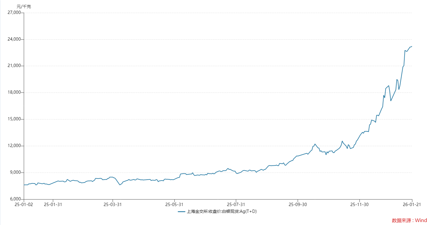 2025年,上海金交所白银现货价格持续上涨,三季度以来增长曲线开始变得陡峭,年末更是直接进入“飙涨”模式。2025年11月21日到2026年1月21日,其价格从11697元/千克迅速上涨至23228元/千克,2个月时间便实现翻倍。