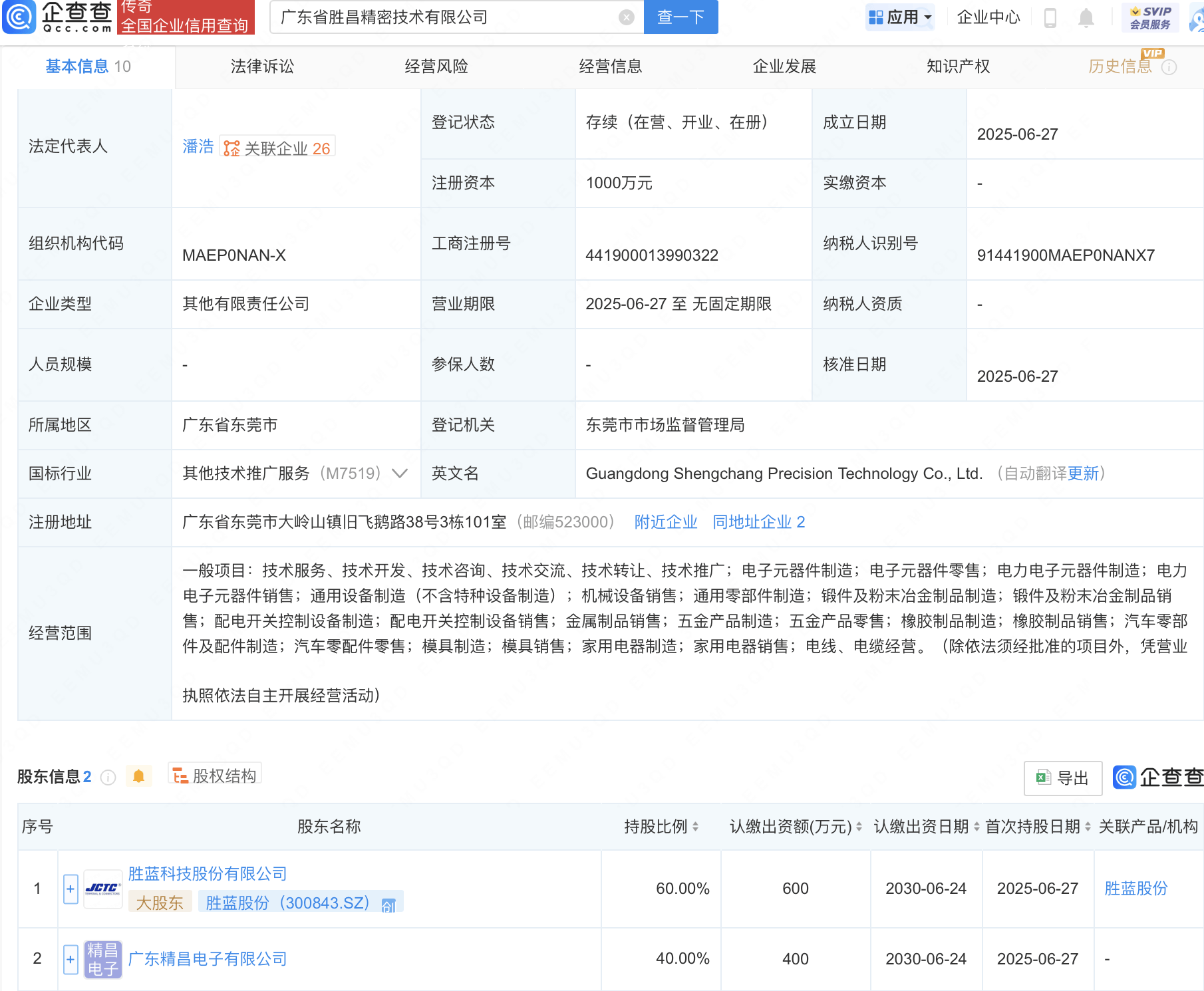 近日,广东省胜昌精密技术有限公司成立,法定代表人为潘浩,经营范围包含:橡胶制品制造;橡胶制品销售;汽车零部件及配件制造;汽车零配件零售等。股权穿透显示,该公司由胜蓝股份(300843)等共同持股。