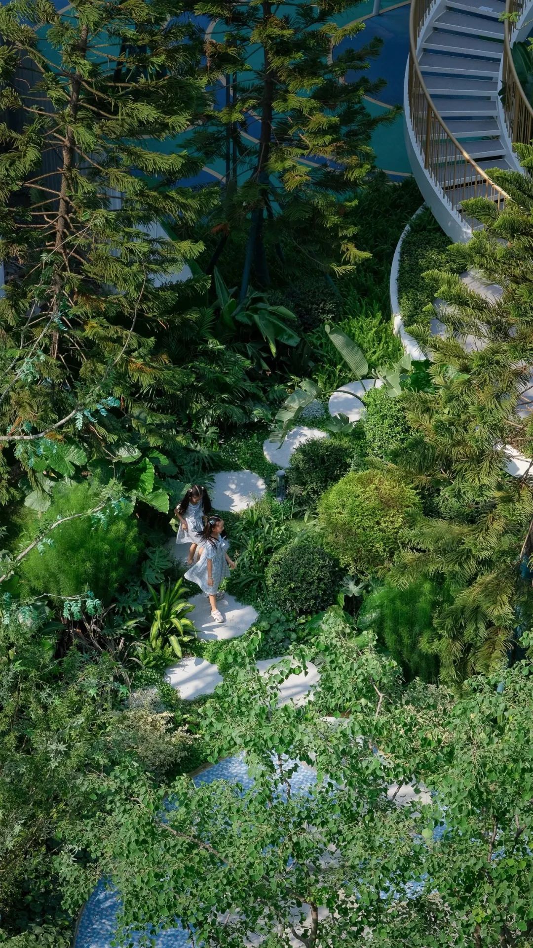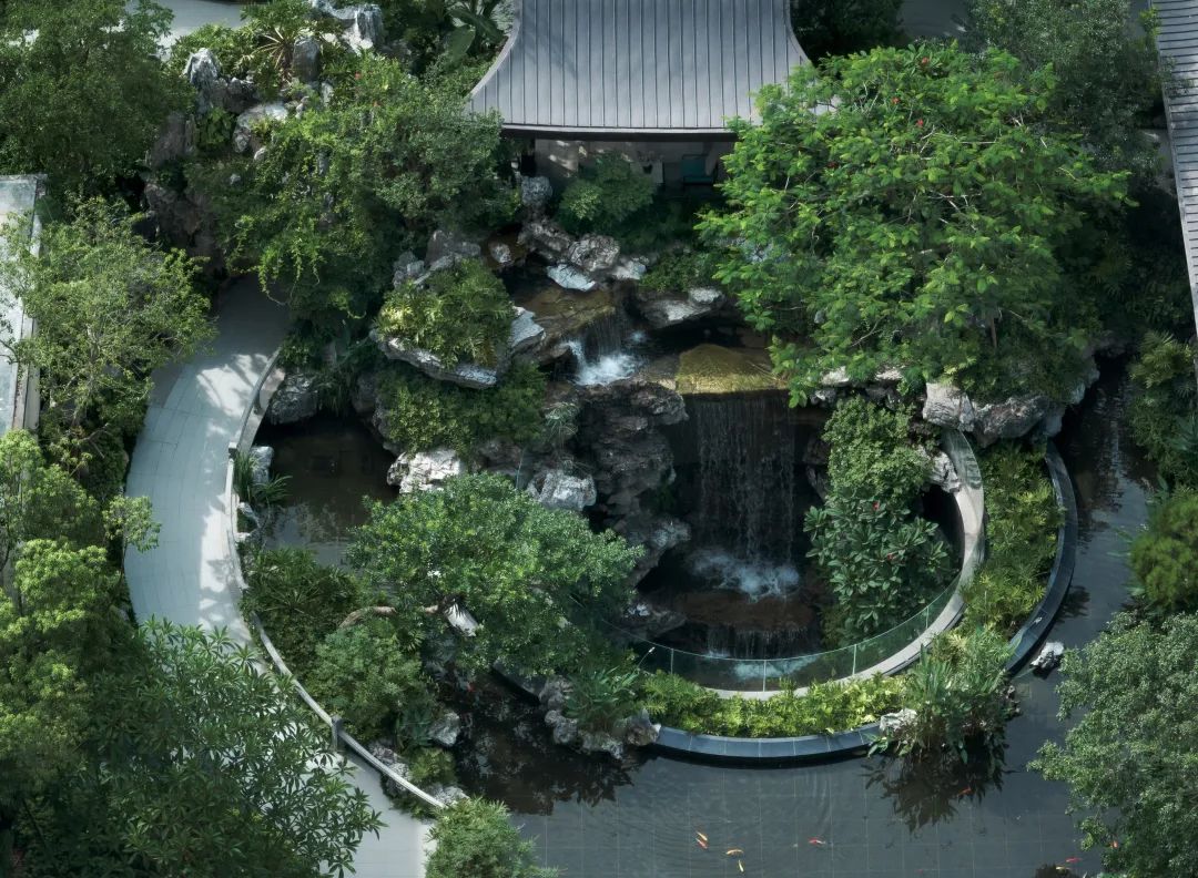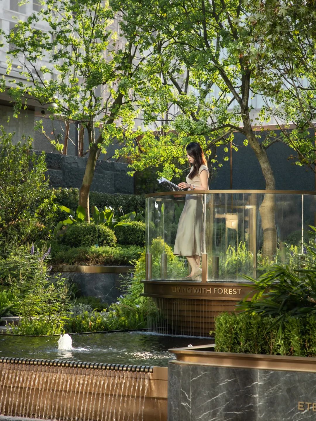 我们试图舍弃人们在传统高端住宅归家礼轴的隆重对称的轴线处理手法,通过叠级水景,精致的森奢美学花园,漂浮空灵的艺术森屿平台,为业主创造一处以自然为载体,源于生活又高于生活的精神空间。