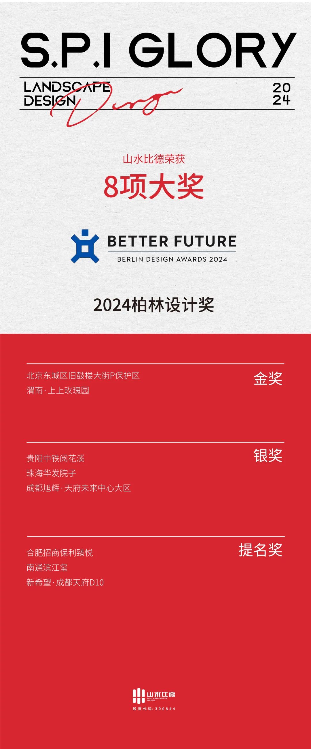 近日,2024 柏林设计奖获奖名单正式揭晓,山水比德凭独具创意设计和专业实力从国内外众多优秀参赛作品中脱颖而出,共斩获8项大奖,其中北京东城区旧鼓楼大街P保护区、渭南·上上玫瑰园荣获金奖,贵阳中铁阅花溪、珠海华发院子、成都旭辉·天府未来中心大区荣获银奖,合肥招商保利臻悦、南通滨江玺、新希望·成都天府D10荣获提名奖。