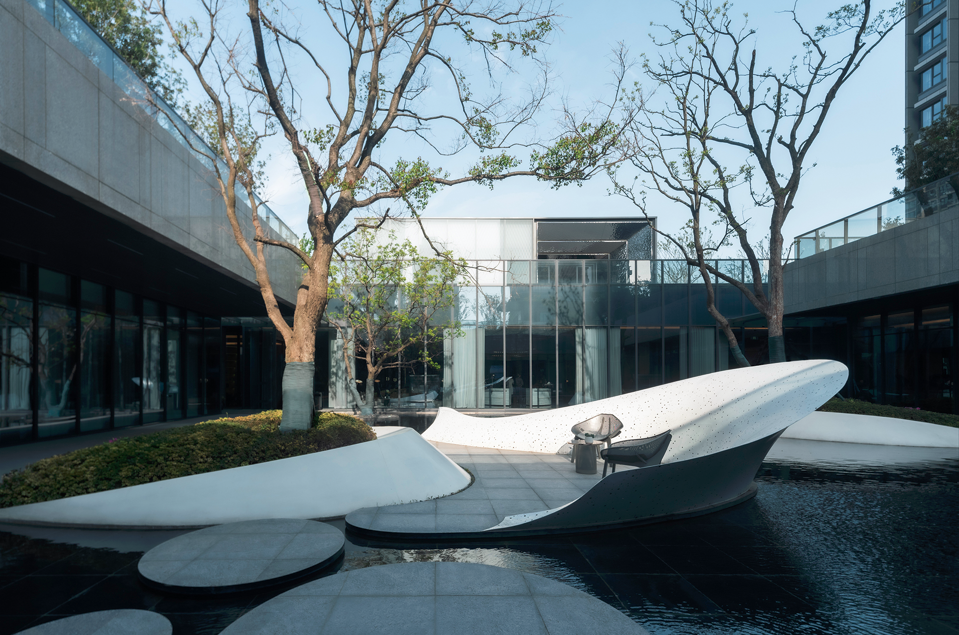 项目设计取“天圆地方”为景观设计框架,以“芥子须弥大千一苇”作为设计总体概念。在山水汇聚之地,自由的水脉划分串联多重生活系统,中心场地为聚集人流的开放生活空间,多角度的景观构成感,大千万物,尽收眼底。