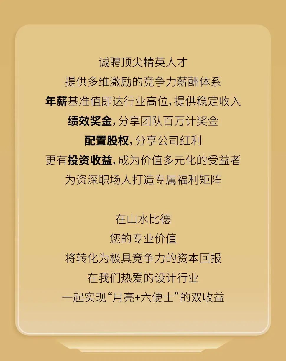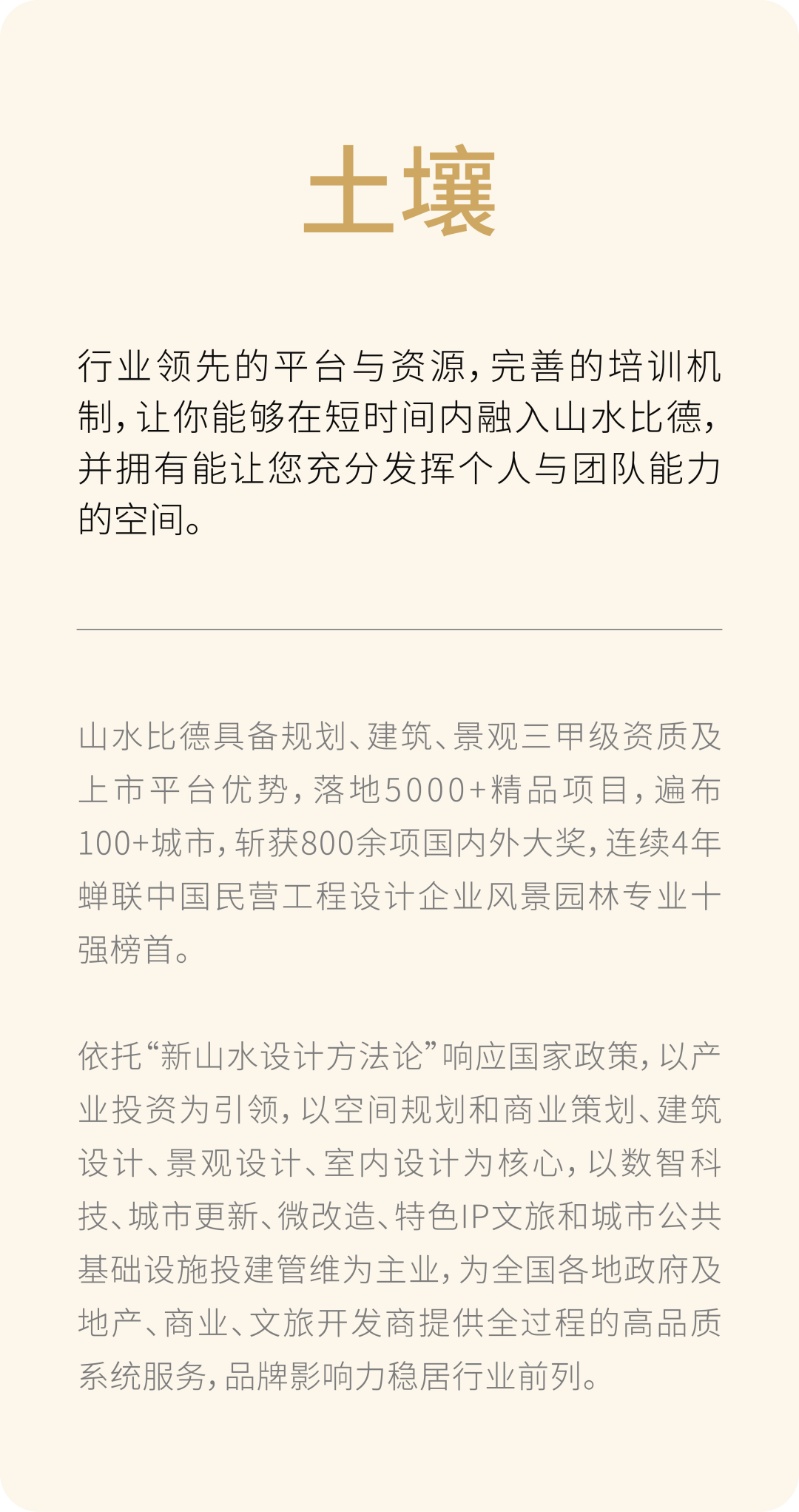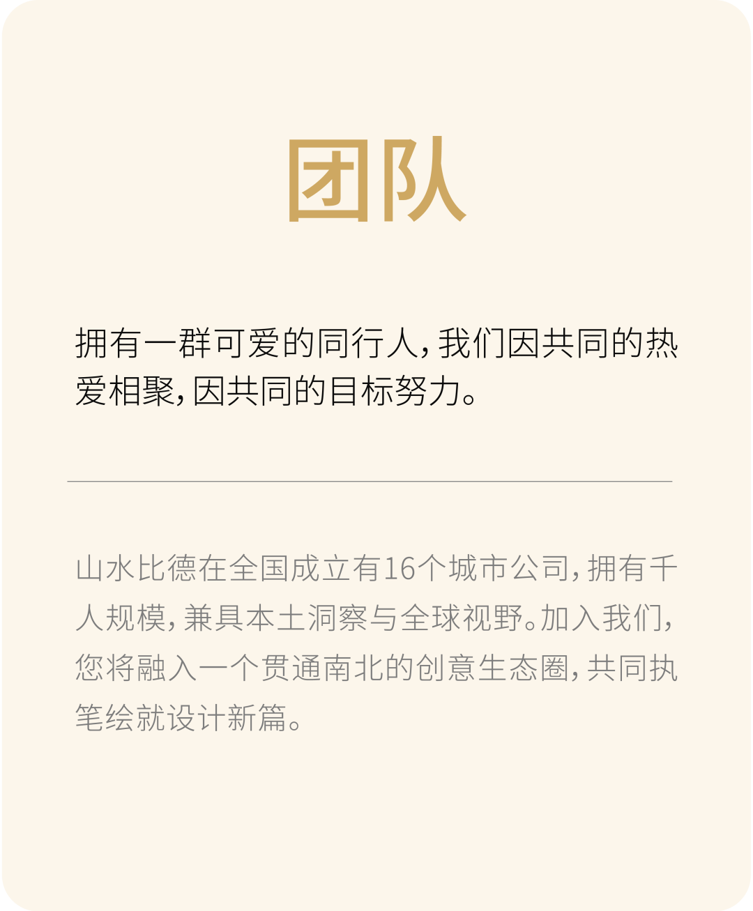 山水比德总部位于广州,在全国成立16个城市公司,拥有千人规模,落地5000+精品项目,遍布100+城市。在创始人兼首席设计师孙虎先生的引领下,公司凭借创新的专业技术和归心的综合服务,先后荣获WLA世界景观建筑奖、IFLA国际大奖、风景园林奖、勘察设计奖等800余项国内外大奖,连续3年蝉联时代楼盘中国地产景观设计竞争力第一,2020ARCHINA建筑中国设计企业品牌新媒体影响力总榜全国第一、民营企业设计企业品牌新媒体影响力全国第一,连续4年蝉联中国民营工程设计企业风景园林专业十强榜首,荣获2021广州文化企业30强、2022胡润中国元宇宙潜力企业榜未来之星、深圳特区建立40周年粤港澳大湾区重点项目“突出贡献单位”、广州市第一批建筑业“链长制”工作示范企业等荣誉。