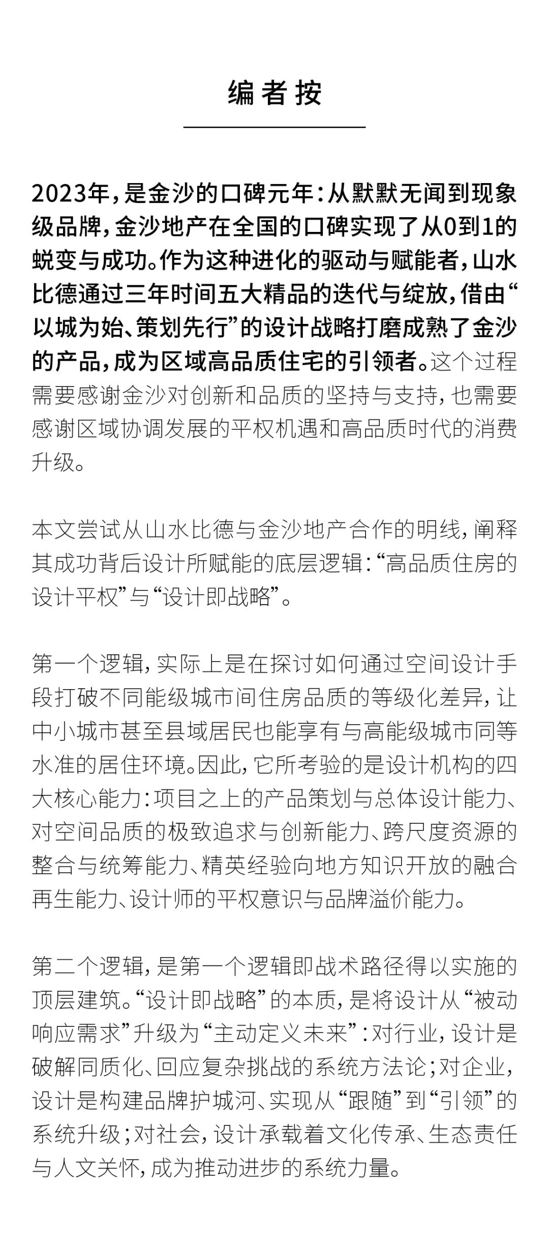 在地产行业步入品质为王的新时代,山水比德携手金沙集团,以创新为引擎,共同探索并实践了一条从0到1打造区域地产标杆的路径。我们的合作深刻展示了如何精准捕捉市场需求、并以高品质住宅引领区域市场升级的策略。