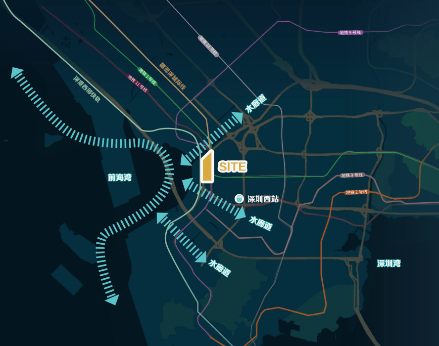 项目位于深圳前海桂湾片区,作为前海“一带一路”贸易组合枢纽的重要载体,串联 1/5/11 号线地铁及穗莞深城际线,以"站?城?人"一体化设计,构建链接全球的超级中心。本次设计将以“聚智向前·海纳百川”为核心理念,延续南头赤湾古海上丝绸之路的文化脉络,以《十二水图》东方意境为基底,重塑“海纳百川”的城市精神图腾。