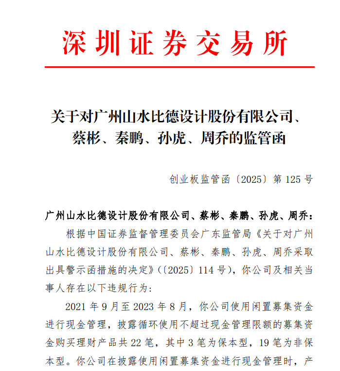 10月20日,山水比德(300844.SZ)发布公告,公司及董事长兼总经理蔡彬等4人收监管函。