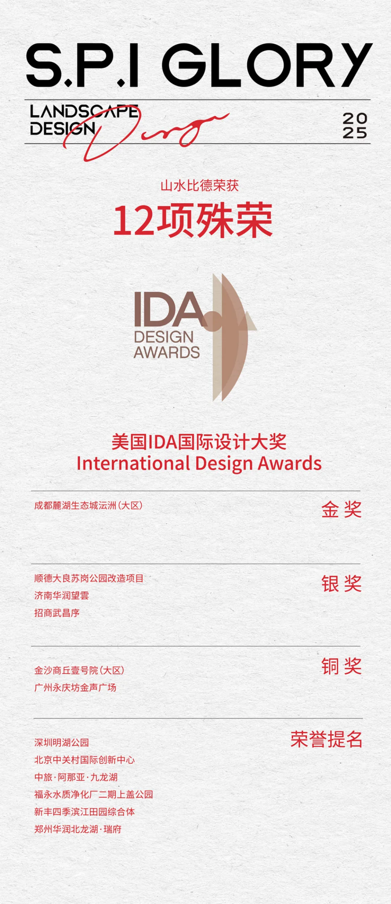 在全球设计行业追求文化赋能与创新突破的发展趋势下,国际权威奖项成为检验设计实力、传递中国设计理念的重要窗口。近日,2025美国IDA国际设计大奖(International Design Awards)获奖名单正式揭晓,广州山水比德设计股份有限公司一举斩获4项重磅荣誉——成都麓湖生态城沄洲(大区)荣获金奖,顺德大良苏岗公园改造项目、济南华润望雲荣获银奖,金沙商丘壹号院(大区)荣获铜奖。此次山水比德获奖项目覆盖住宅社区、城市公园等多元核心场景,均深度践行“新山水设计方法论”,将自然生态、在地文化与现代生活需求精准融合,展现出独特的设计巧思、专业深度与人文温度。