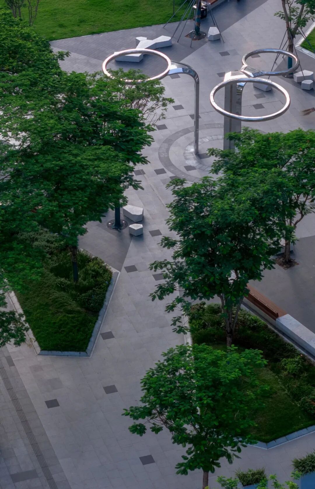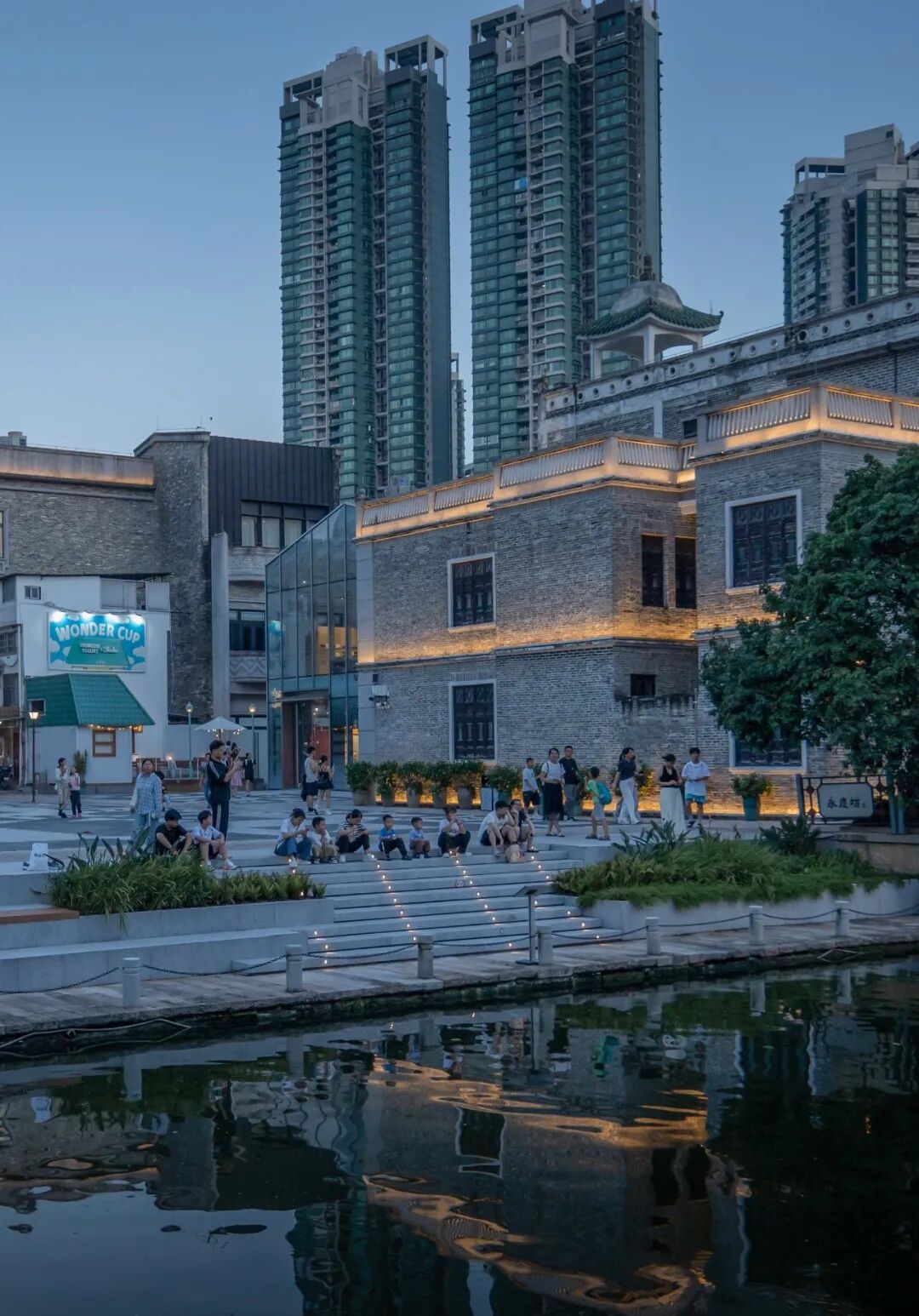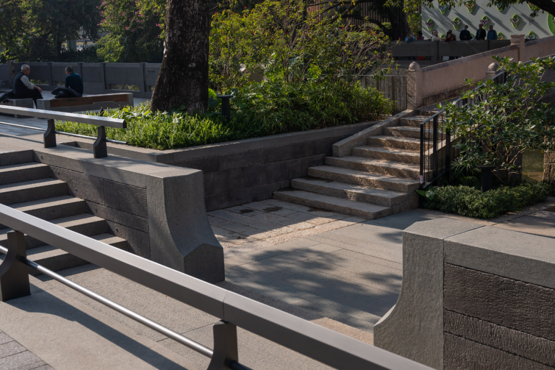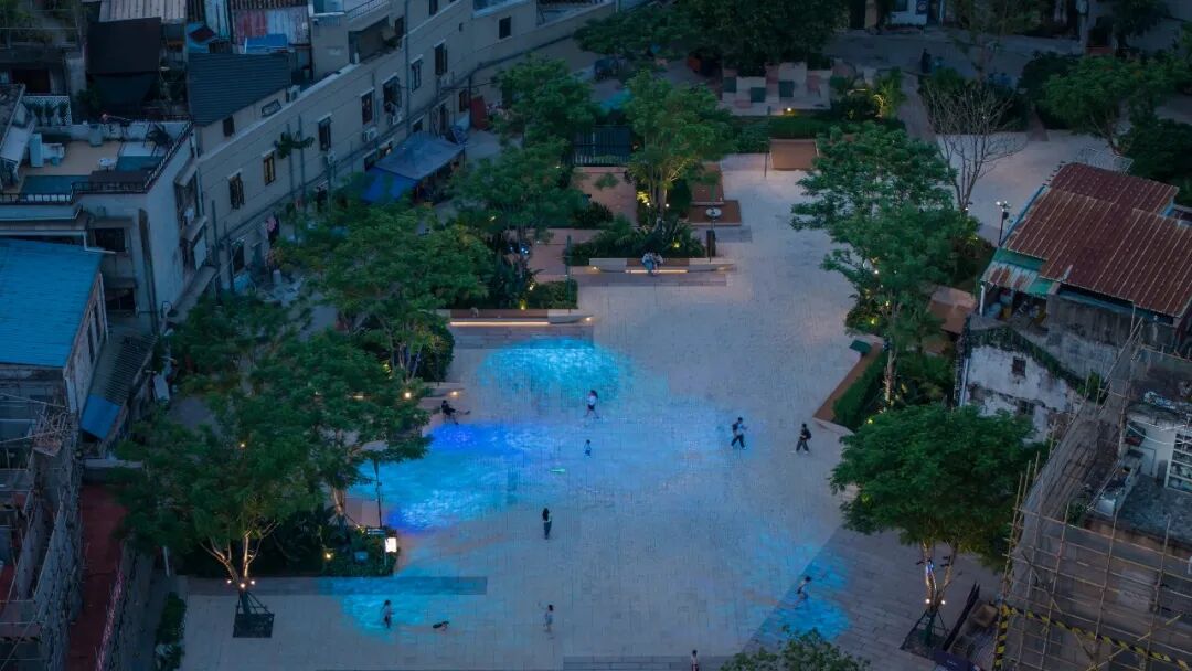 吉祥广场以“燕归来”为主题,融合岭南花砖与几何铺装,延续西关中西交融风格。大地广场围绕“月是故乡明”,以暖色调铺装与艺术灯光营造温馨氛围,结合绿地为居民提供休憩空间。两广场建成后,将4500㎡的消极空间转化为连接恩宁涌与社区的“金角银边,深受市民欢迎与官方认可。