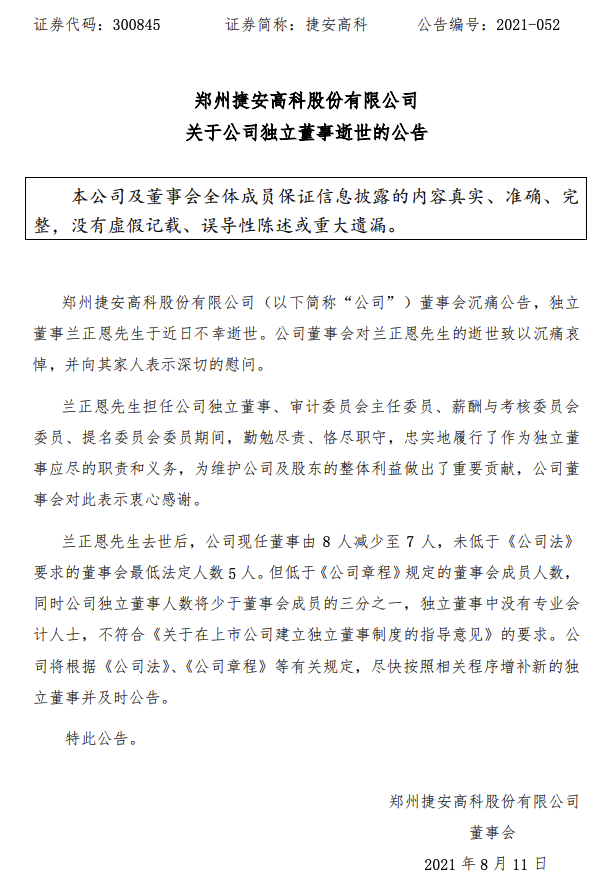 8月11日晚间,捷安高科在深交所发布公告称,公司独立董事兰正恩先生于近日不幸逝世。公司董事会对兰正恩先生的逝世致以沉痛哀悼,并向其家人表示深切的慰问。公司将根据《公司法》、《公司章程》等有关规定,尽快按照相关程序增补新的独立董事并及时公告。