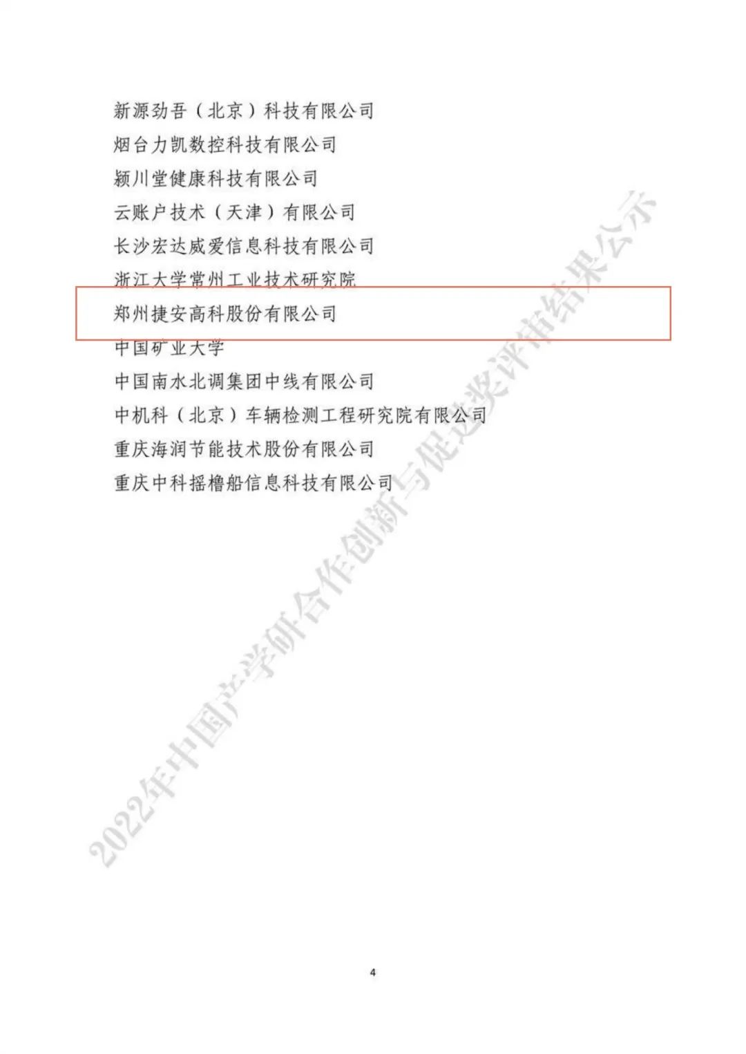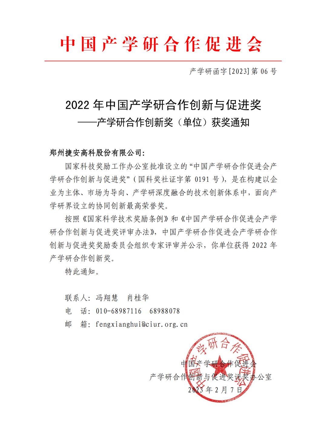 全国共58家科研高校及企业获得“2022年中国产学研合作创新奖(单位)”,郑州捷安高科股份有限公司位列其中。奖项的取得是对捷安高科产学研工作深度融合创新的认可,也将促进捷安高科在产学研协同创新及成果转化上继续探索前行。