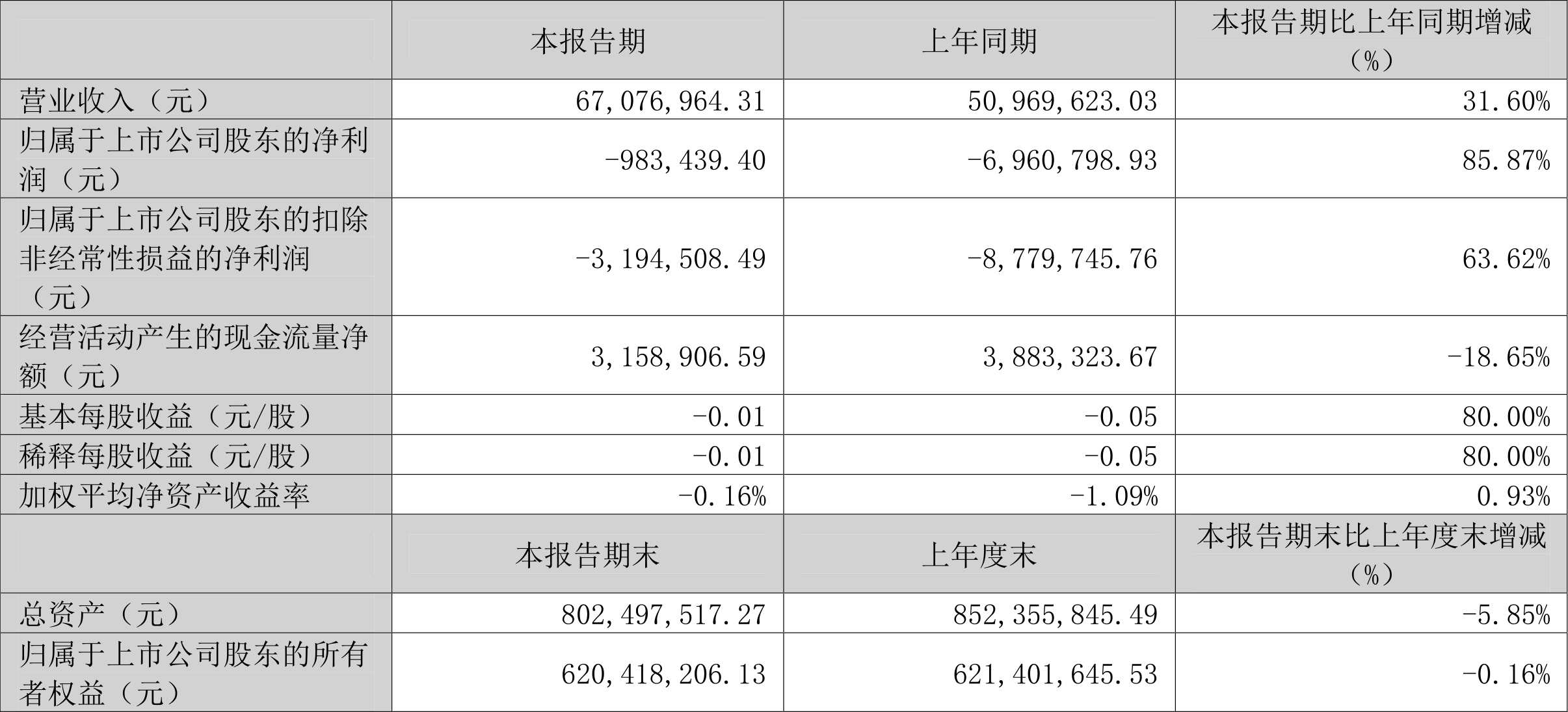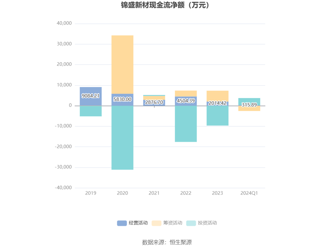 2024年第一季度,公司经营活动现金流净额为315.89万元,同比下降18.65%,主要系本期业务量变动所致;筹资活动现金流净额-2556.58万元,同比减少3888.00万元,主要系本期短期借款减少所致;投资活动现金流净额3416.42万元,上年同期为-2531.98万元,主要系本期理财到期收回所致。