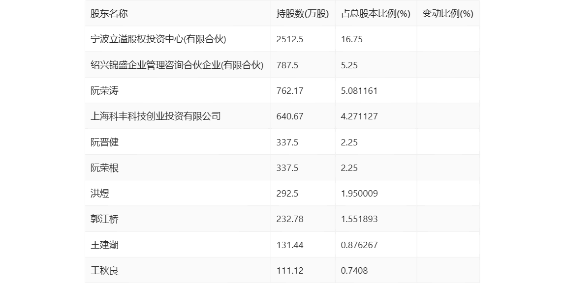 一季报显示,2024年一季度末公司十大流通股东中,持股最多的为宁波立溢股权投资中心(有限合伙),占比16.75%。十大流通股东名单相比null年年报维持不变。在具体持股比例上,洪煜、王秋良持股有所下降。