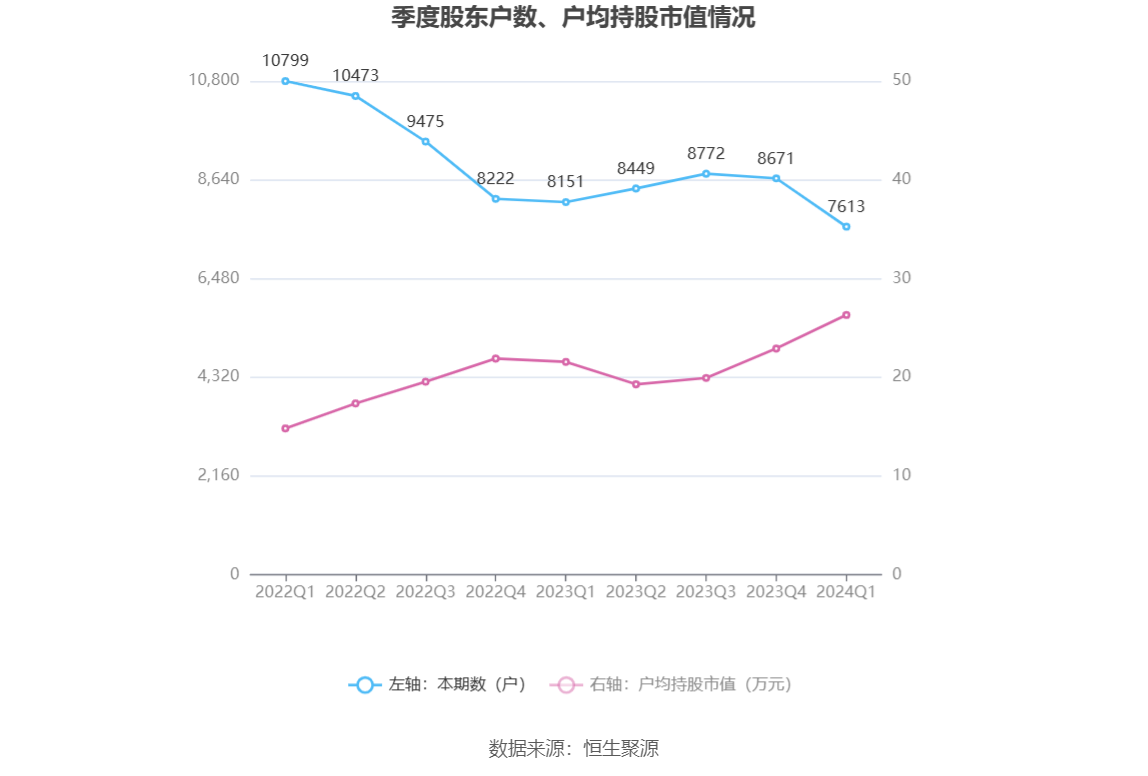 筹码集中度方面,截至2024年一季度末,公司股东总户数为7613户,较上年末下降了1058户,降幅12.20%;户均持股市值由上年末的22.90万元上升至26.30万元,增幅为14.85%。
